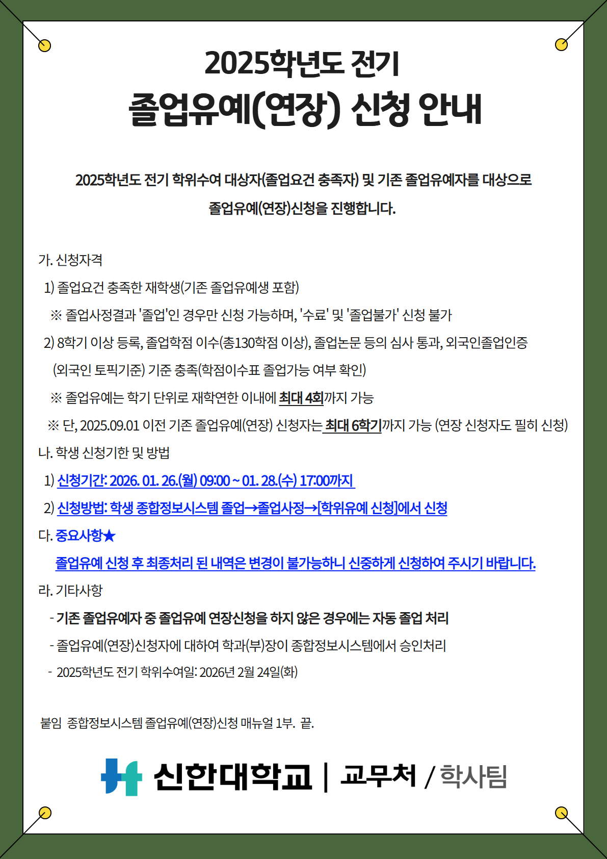 [학사팀/졸업유예] 2025학년도 전기 졸업유예(연장) 신청 안내