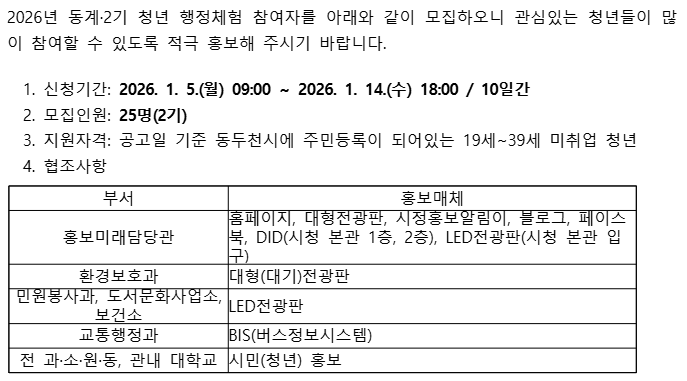 2026년 동계·2기 청년 행정체험 참여자 모집 홍보