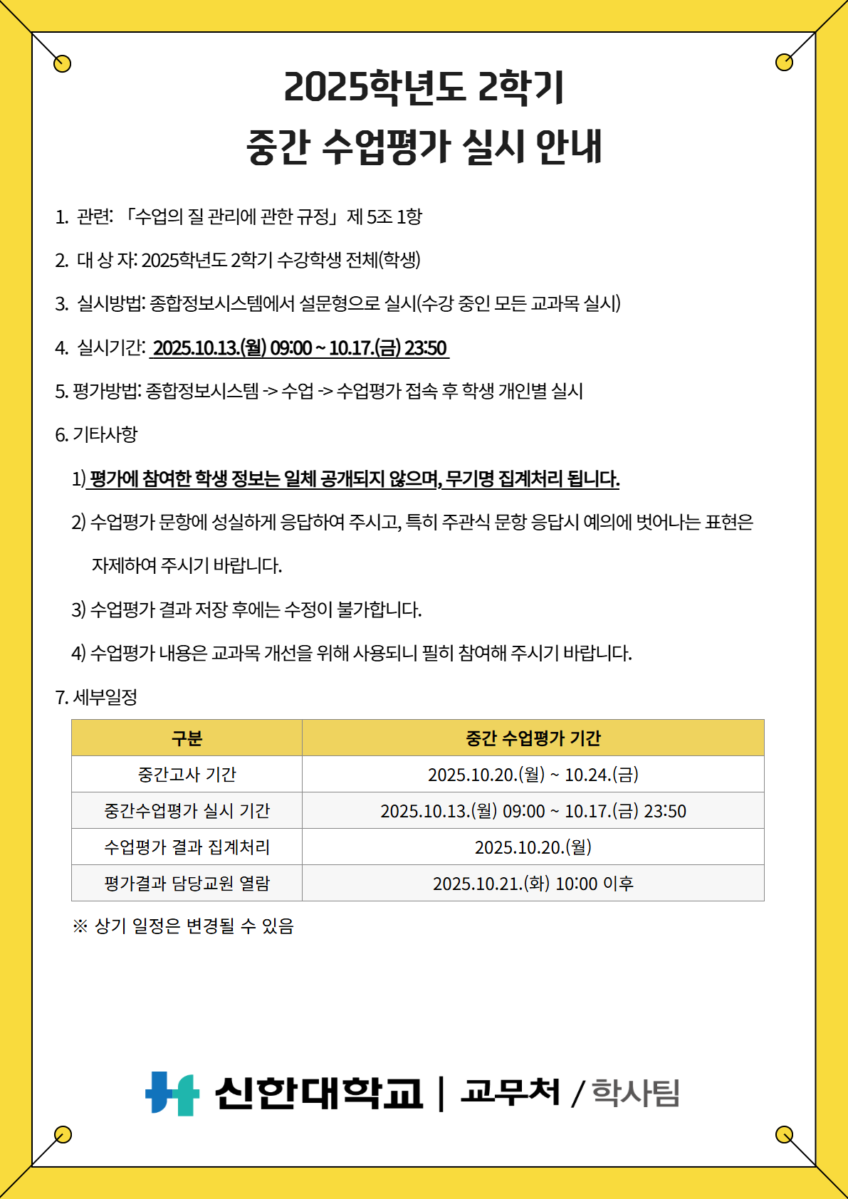 [학사팀/수업] 2025학년도 2학기 중간 수업평가 실시 안내