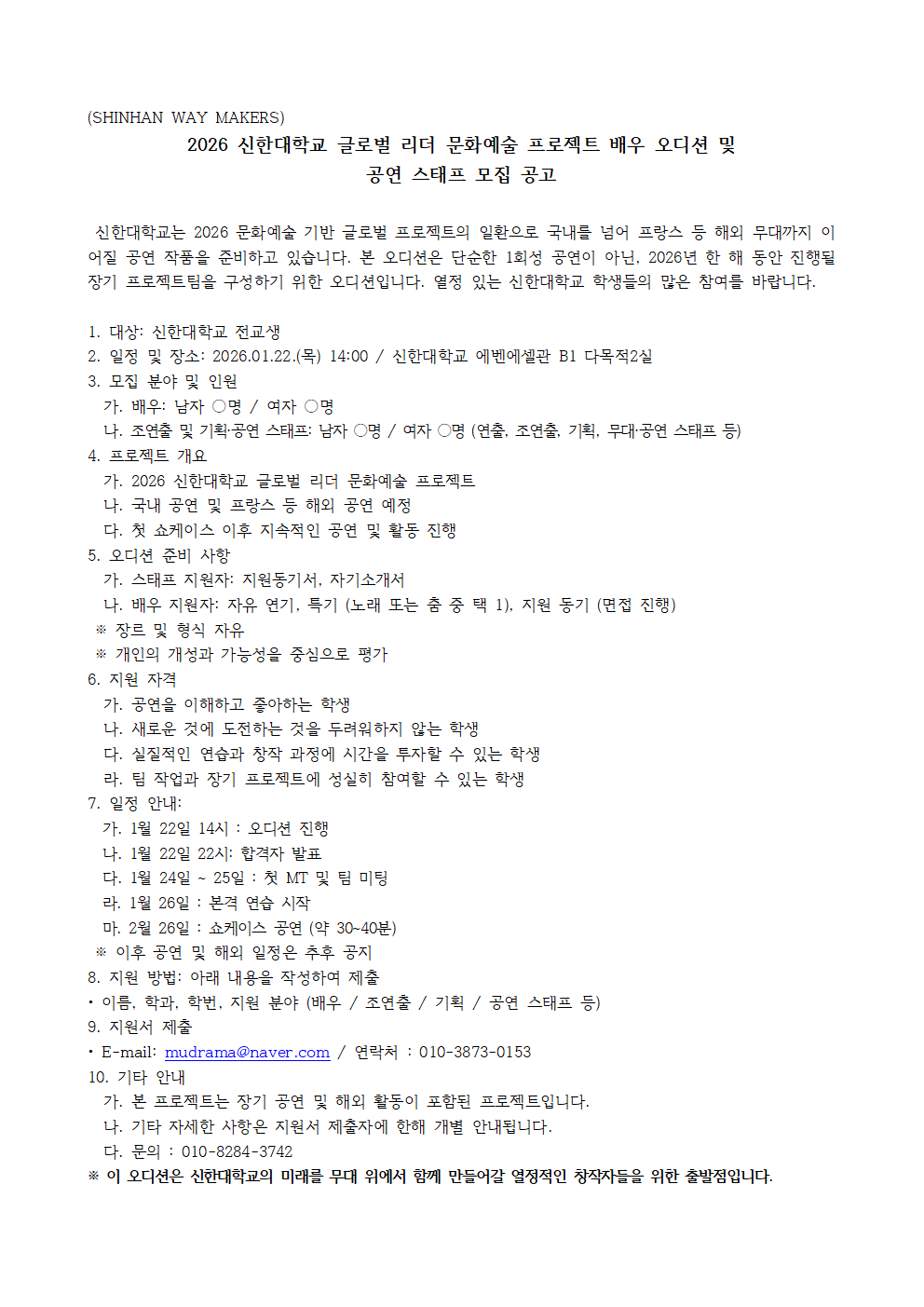 'SHINHAN WAY MAKERS 공연 오디션 모집 공고' 안내